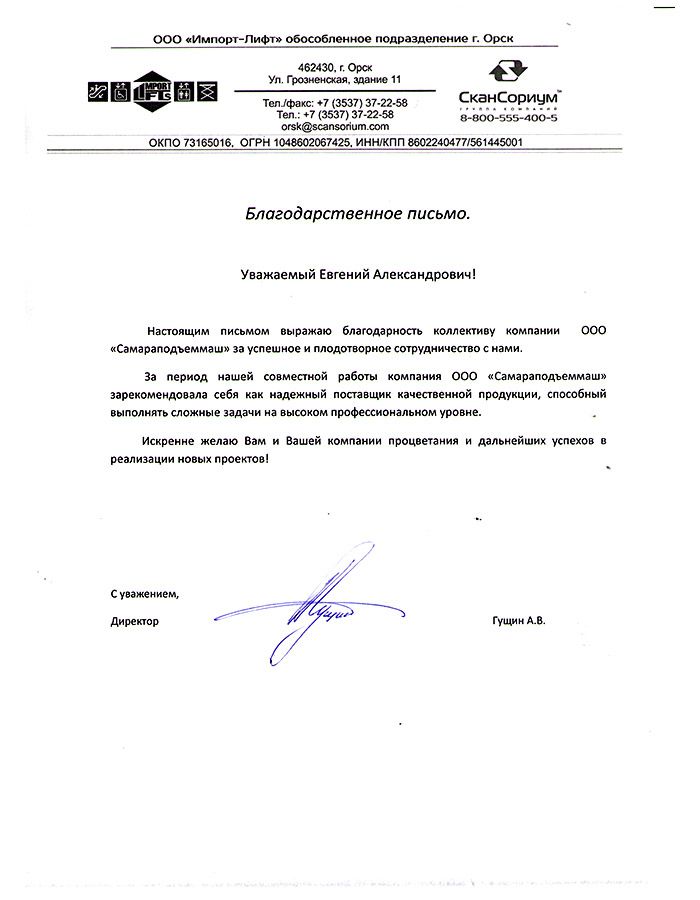 Директор ООО «Импорт-Лифт» Гущин А.В.